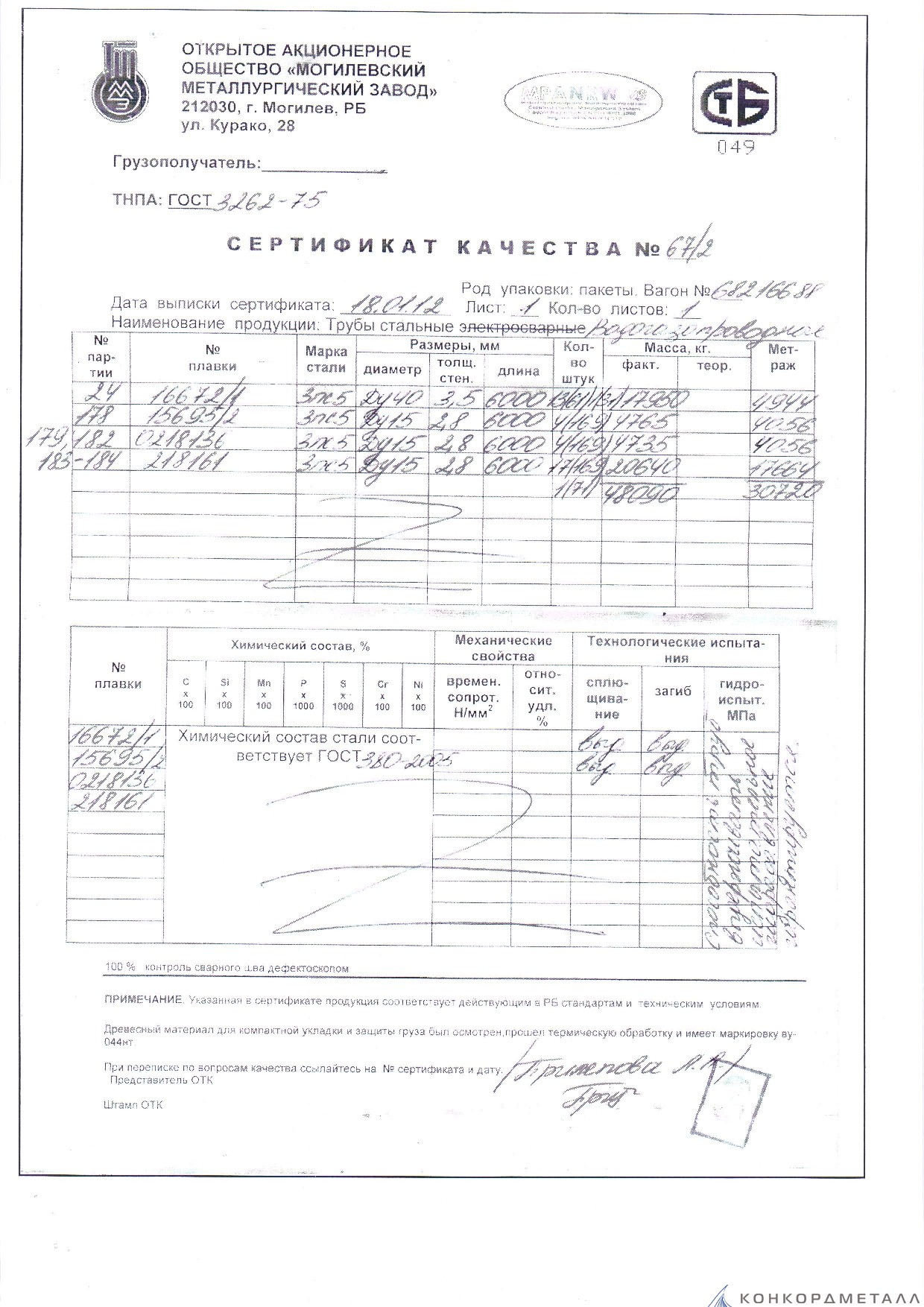 С каждой товарной позицией мы предоставляем все сертификаты и паспорта качества, а также товарно-транспортную накладную.